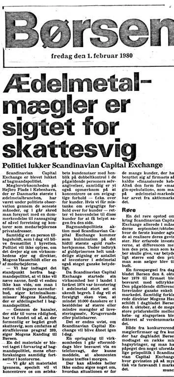 Front page headlines: The Special Prosecution closes Scandinavian Capital Exchange – Making charges for serious tax evasion against Denmark’s largest bullion dealer – Heading: Precious metal dealer accused of tax evasion Police close Scandinavian Capital Exchange Scandinavian Capital Exchange has been closed by Bagmandspolitiet. “Through channels which we control we have found out that possible serious tax evasion has taken place, according to the criminal code paragraph 289 tells Mogens Kanding Børsen”.