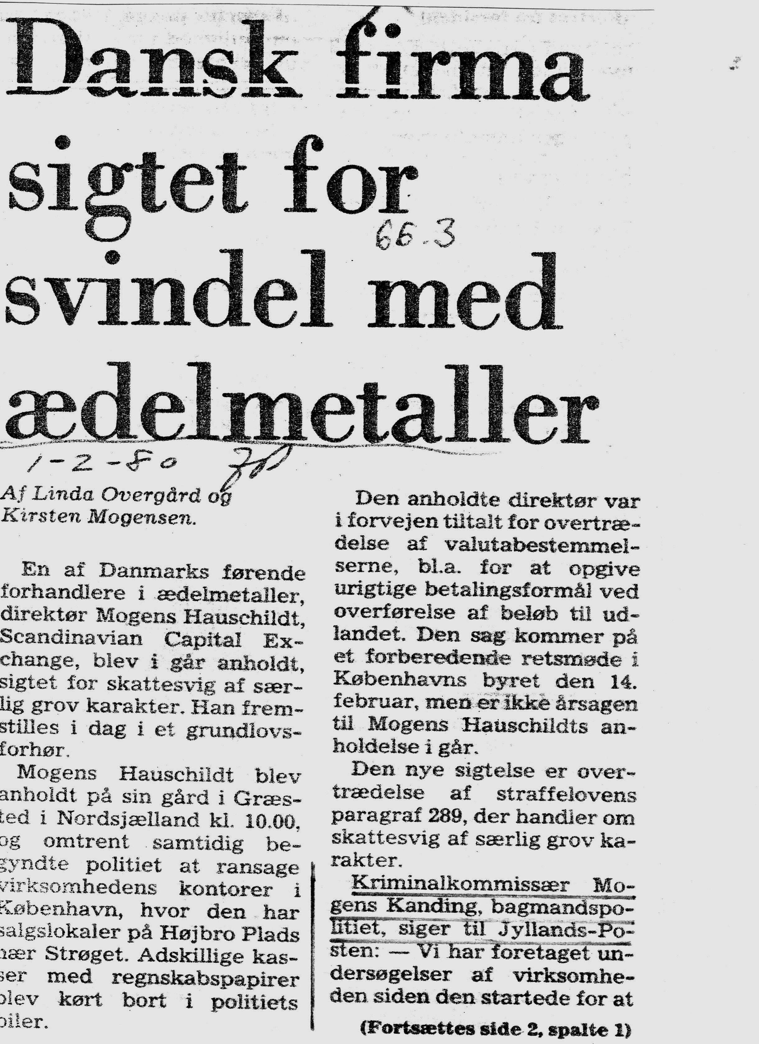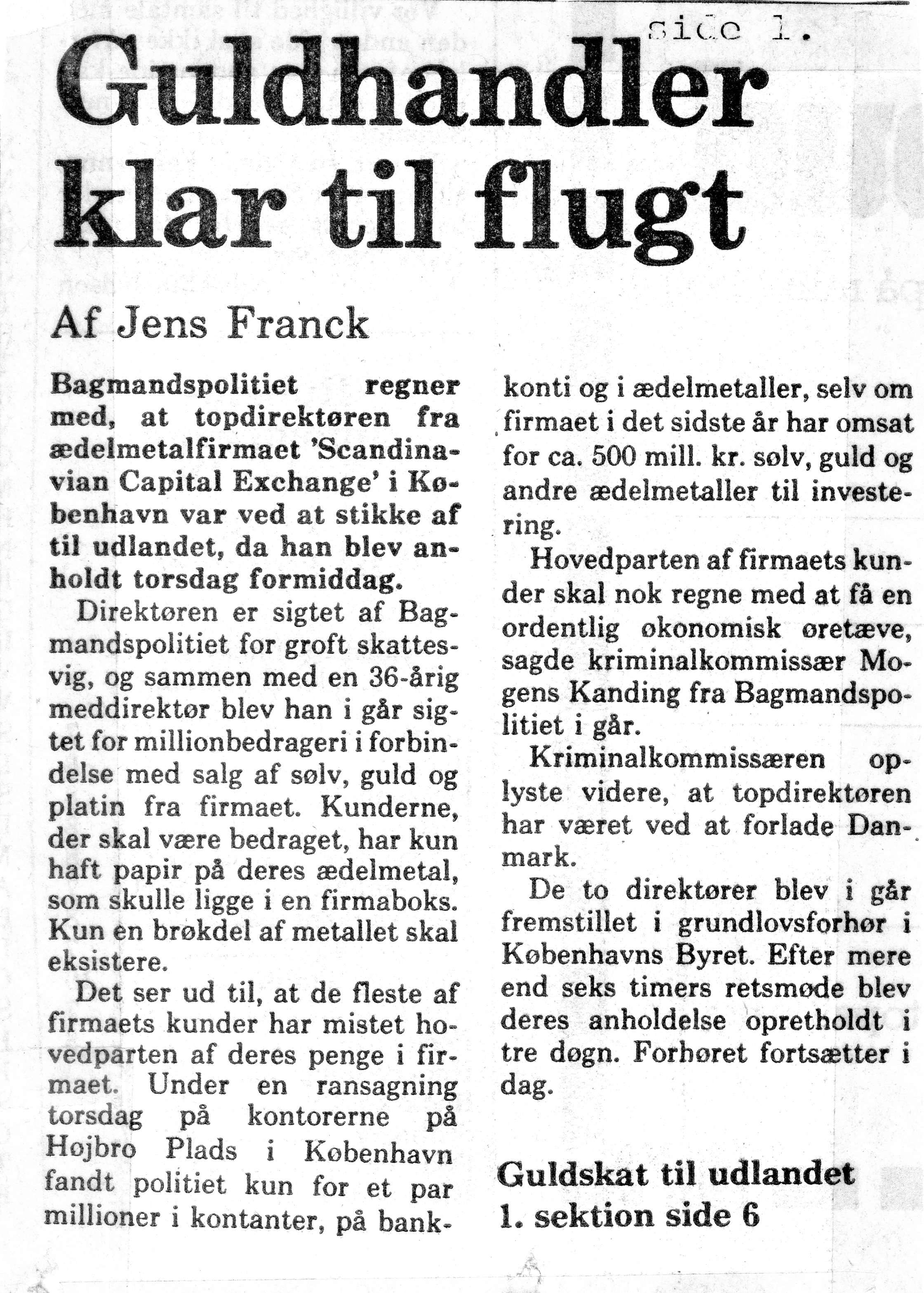 The arrest yesterday has nothing to do with the National Bank’s complaints according to Prosecutor Finn Meilby (head of Bagmandspolitiet). Bagmandspolitiet have, for various reasons, felt inclined to investigate Scandinavian Capital Exchange business closely and compare information from tax authorities and the customs and excise office and have, through this, found a reason to charge for tax evasion… We found material there to confirm our existing knowledge about the company. We have investigated the case for about a month and the reason is that huge speculation in precious metals brought our attention to this and other companies have told criminal commissioner Mogens Kanding… I will not say that we closed the business with our action, but the company cannot pay out money nor receive money”