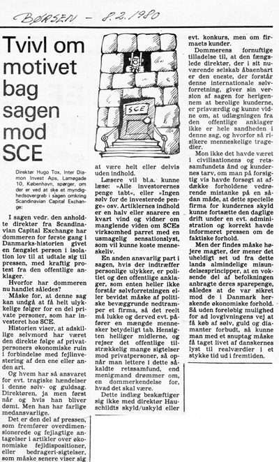 Although the public got to know about my arrest, the closing of the companies and my solitary confinement on the television evening news, neither the public nor the media was ever told the truth about what went on for five years before that the Special Prosecution (Bagmandspolitiet) and the tax and fiscal Revenue stormed the SCE and arrested me for alleged tax evasion. In reading the article in Jyllands-Posten, Friday the 1st February 1980 (read the article in Danish), the day after my arrest the public was told that the Special Prosecution had been investigating the company since its start, five years earlier.